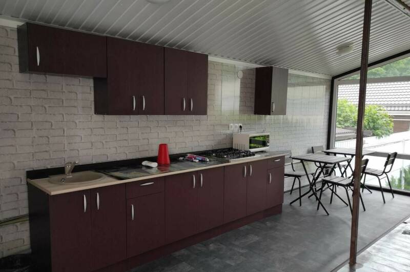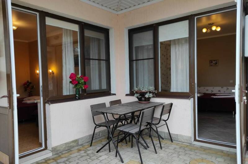 Гостевой дом имеет очень красивый парк с прудиками, мостиками, скамейками, столиками с зонтами и большой беседкой с барбекю. Размер парка 12 соток и закрыт хорошим красивым забором от посторонних. Во дворе можно поиграть в настольный теннис. Также есть беседка под виноградом. Детская площадка с со спортивным комплексом.