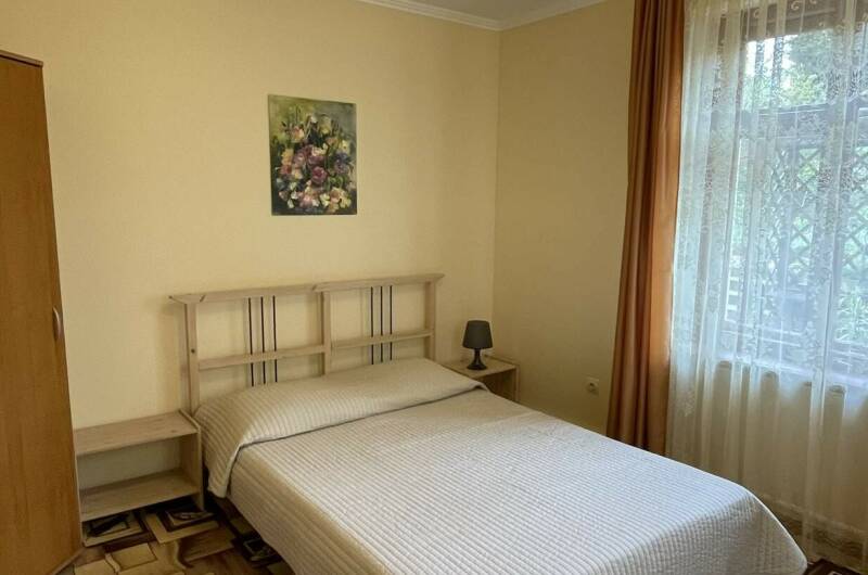 Первый этаж поделен на 2 части, на два 2-х комнатных номера. Номера на 1 этаже с отдельным двором, отдельным входом, личной беседкой, кухней. В номерах своя кухня для самостоятельного приготовления, душ, туалет.